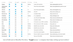 Here’s a useful list comparing EORs compiled by Rodolphe Dutel, Buffer’s ($8M payroll/year, +15 countries) former Director of Operations and Finance: